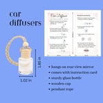 Car diffusers are sturdy 8 ml glass bottles with a wooden cap that are 1.02in x 1.85in. They have a pendant rope that allows you to hang it from your rear view mirror. Diffusers are packaged in a small mesh drawstring bag and put into a 4x6in black padded envelope with an instruction card on how to use it. The contents of the diffusers are essential/fragrance oils mixed with all natural reed diffuser base from Makesy. Liquid should be clear or yellowish depending on what essential/fragrance oils are used.